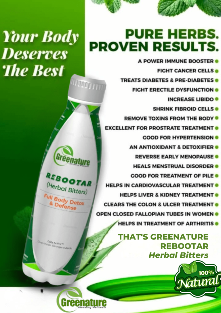 GREENATURE INTERNATIONAL HERBAL PRODUCT STARTED OFFICIALLY HERE IN NIGERIA AS A MULTI LEVEL MARKETING COMPANY IN NOVEMBER 2025 WITH THE FIRST FLAGSHIP PRODUCT CALLED REBOOTAR HERBAL BITTERS WITH LOTS OF HEALTH TESTIMONIES. YOU ALL REALLY NEED TO GET A BOTTLE FOR YOURSELVES.